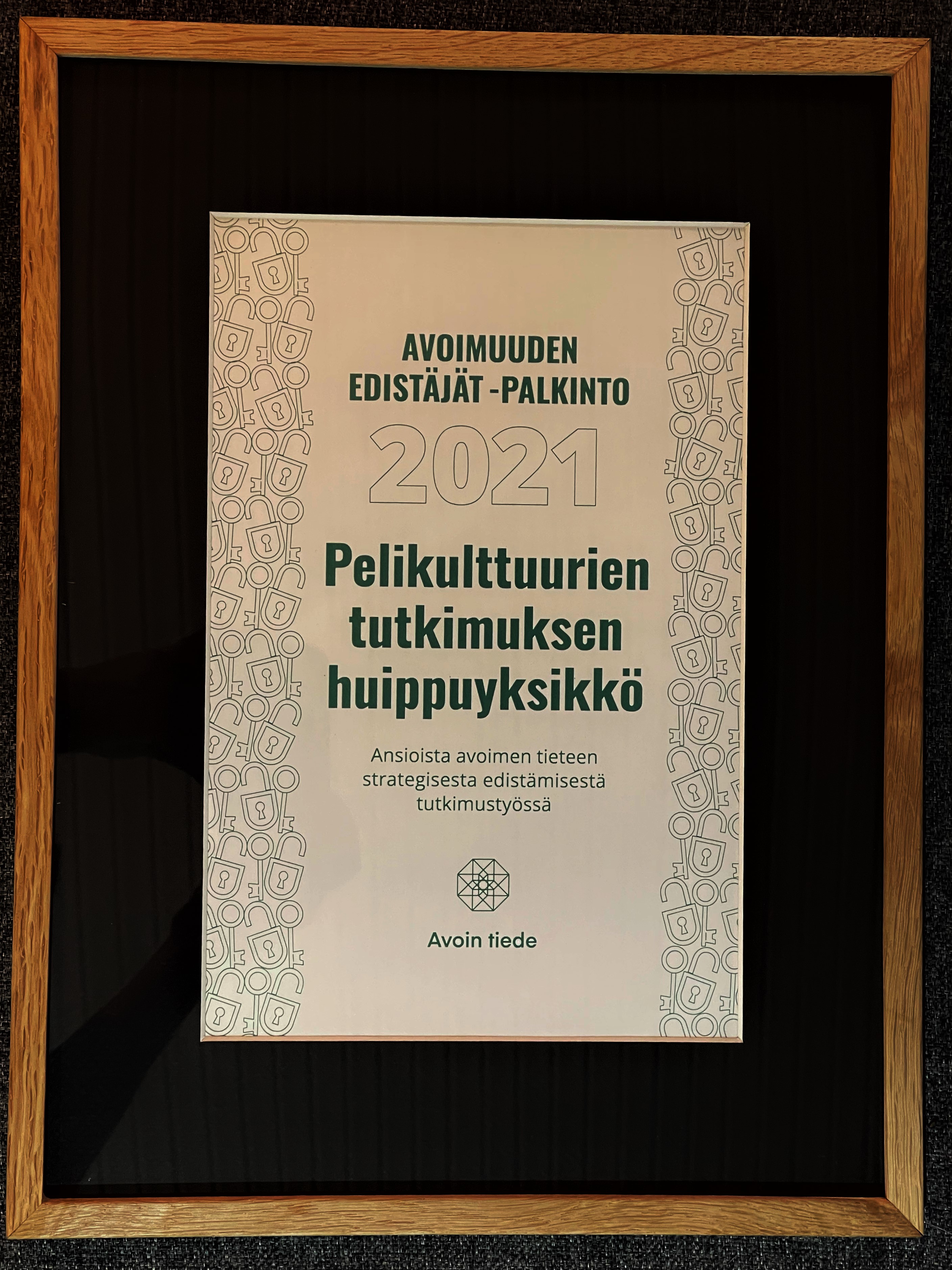 Nyt meille myönnetty tunnustus toivottavasti tekee pelikulttuurien tutkimusta entistä laajemmin tunnetuksi, ja tarjoaa meille lisää mahdollisuuksia edistää tieteen, kulttuurin ja yhteiskunnan avoimuutta ja tasa-arvoa. Kiitokset!