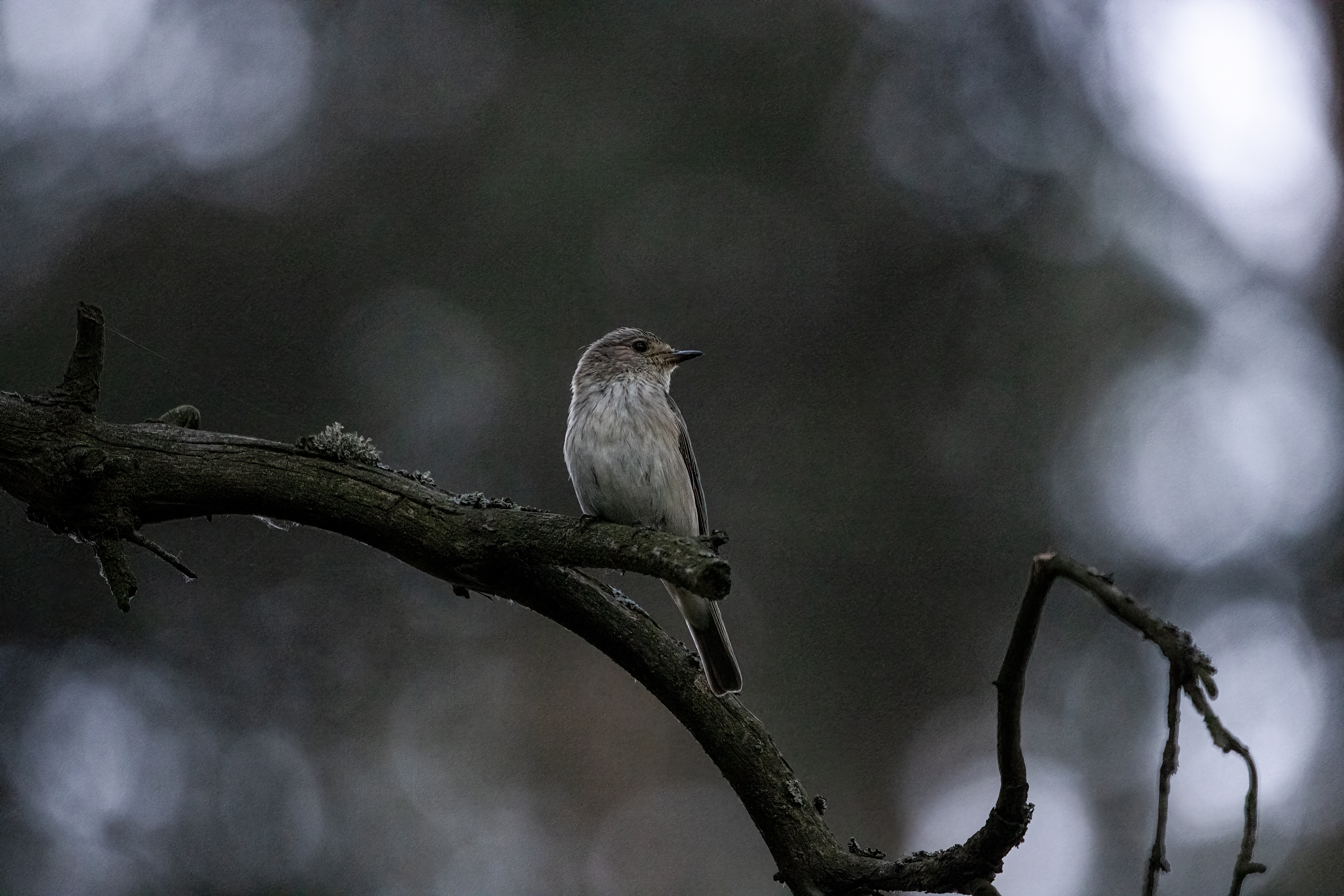 Muscicapa striata, the spotted flycatcher/harmaasieppo (testing R5 in a low light, fast situation inside a forest).