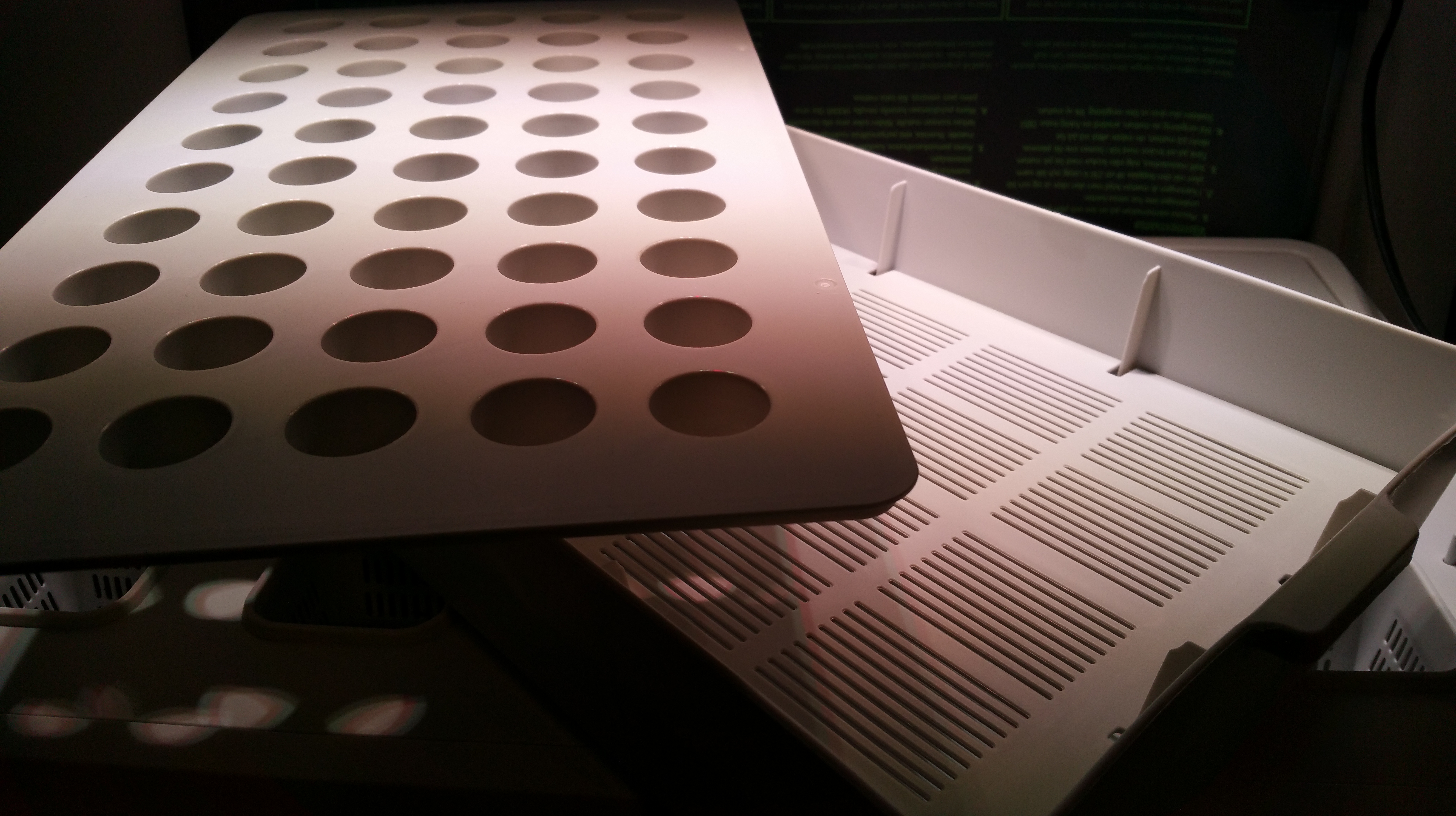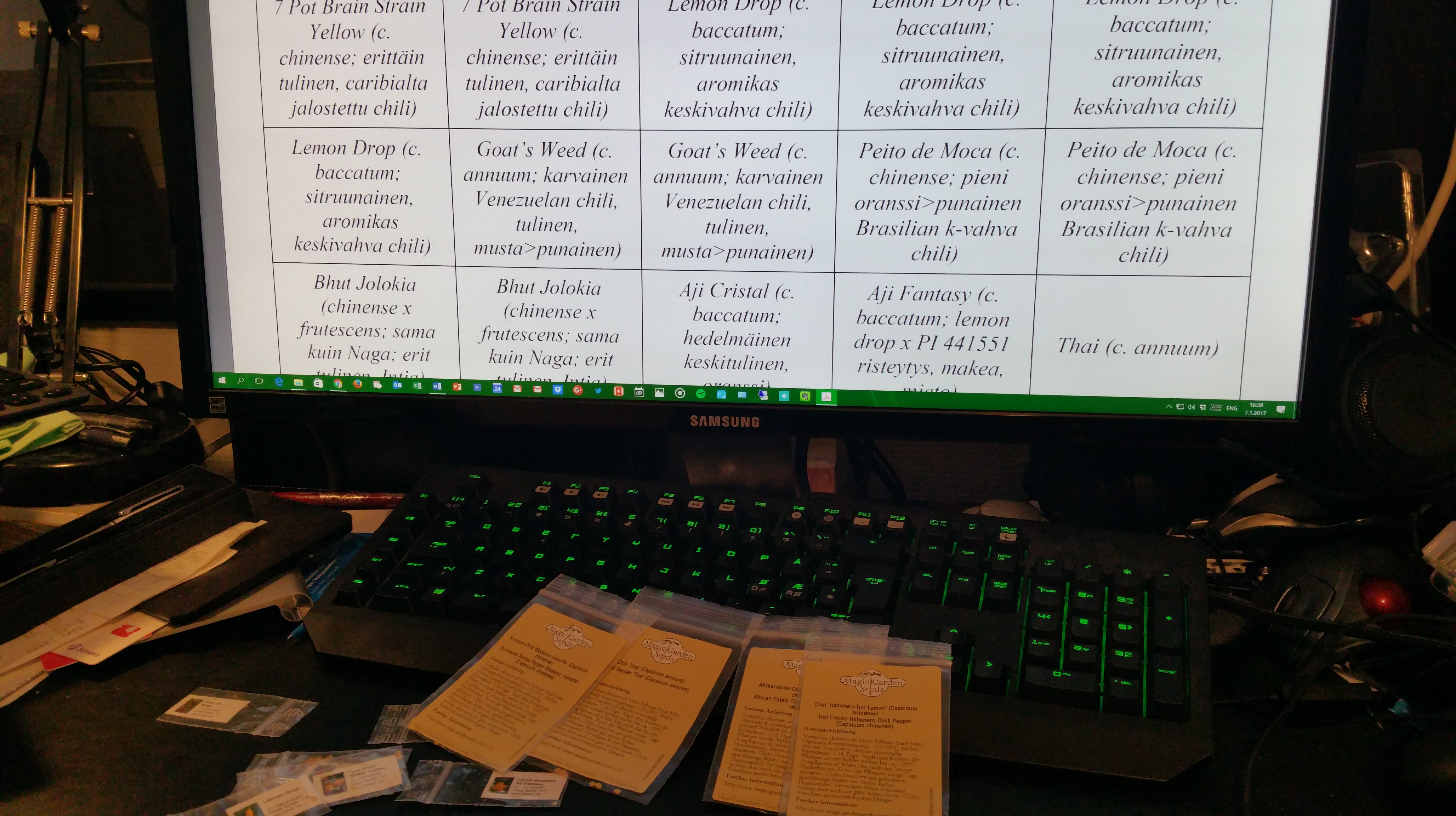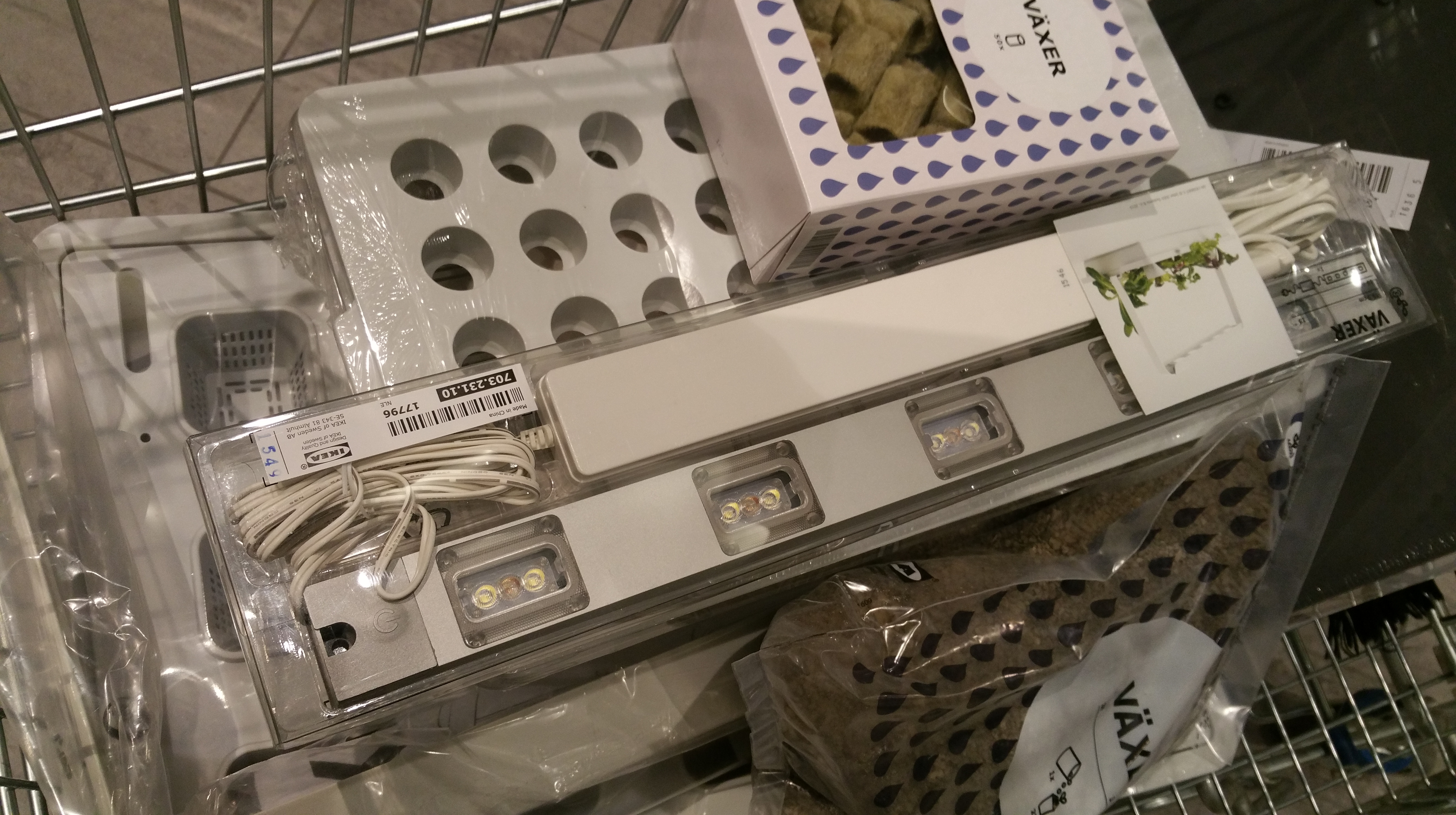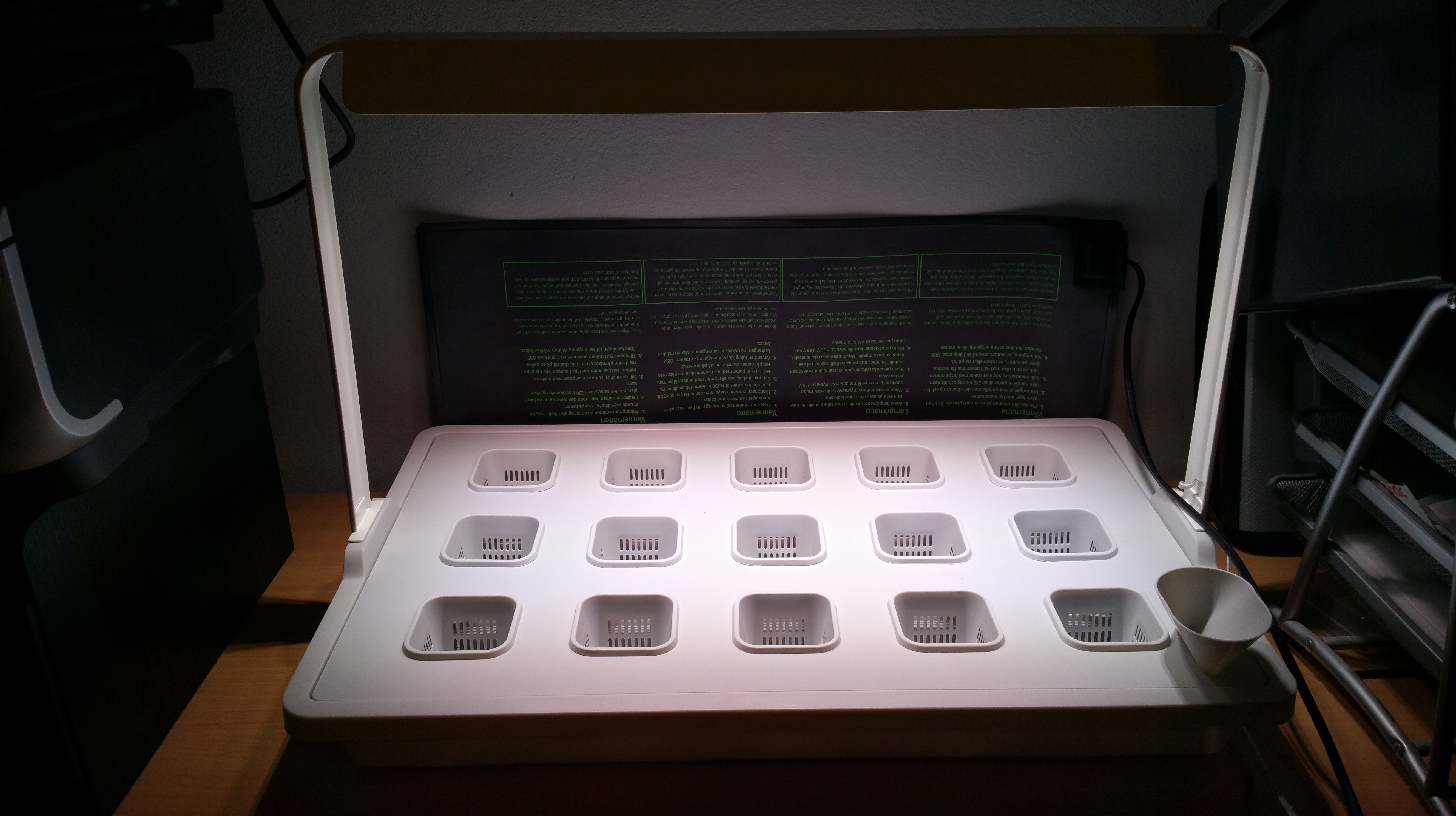 The LED light system was bit of a challenge to install so that I can adjust the right height of lamps from the tops of chili plants (without fastening anything to the ceiling, as our panels cannot take it). This time it was right spot for an “IkeaHack”: the “elevators” for LED strips were installed into a Ikea MULIG cloth rack. Underneath the entire system a 80 x 80 cm plastic vat was installed, just to be secure with all that water. The outcome is perhaps not very beautiful, but it seems functional enough. Let’s see how the Canna Coco A+B solution that I am feeding them will work out. I am following the mild, rooting phase solution recipe at this point: 20 ml of both fertilizers into a 10 L bucket of water.