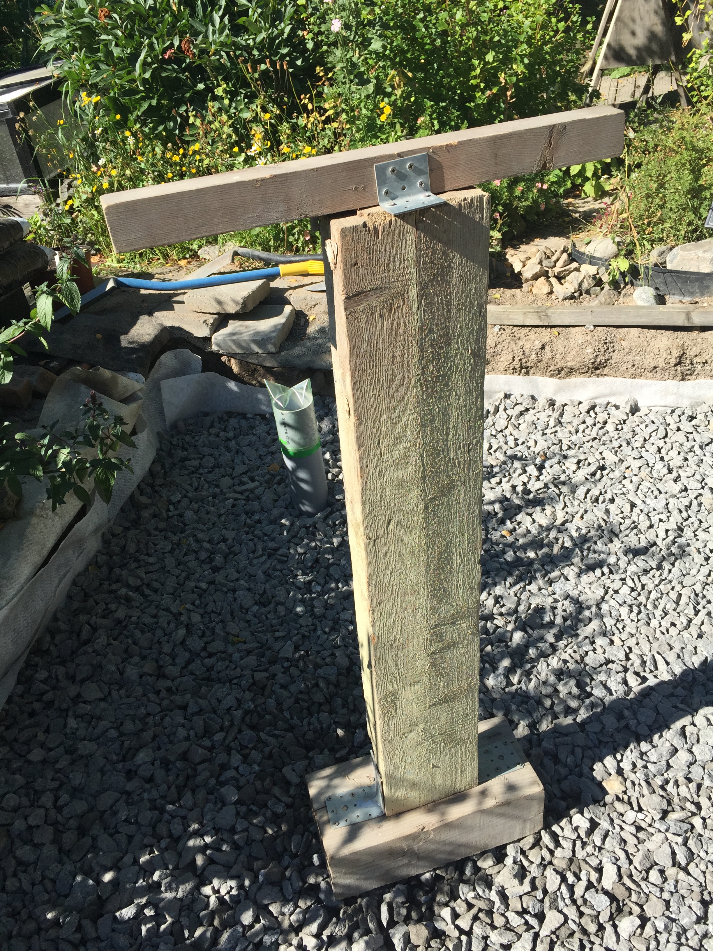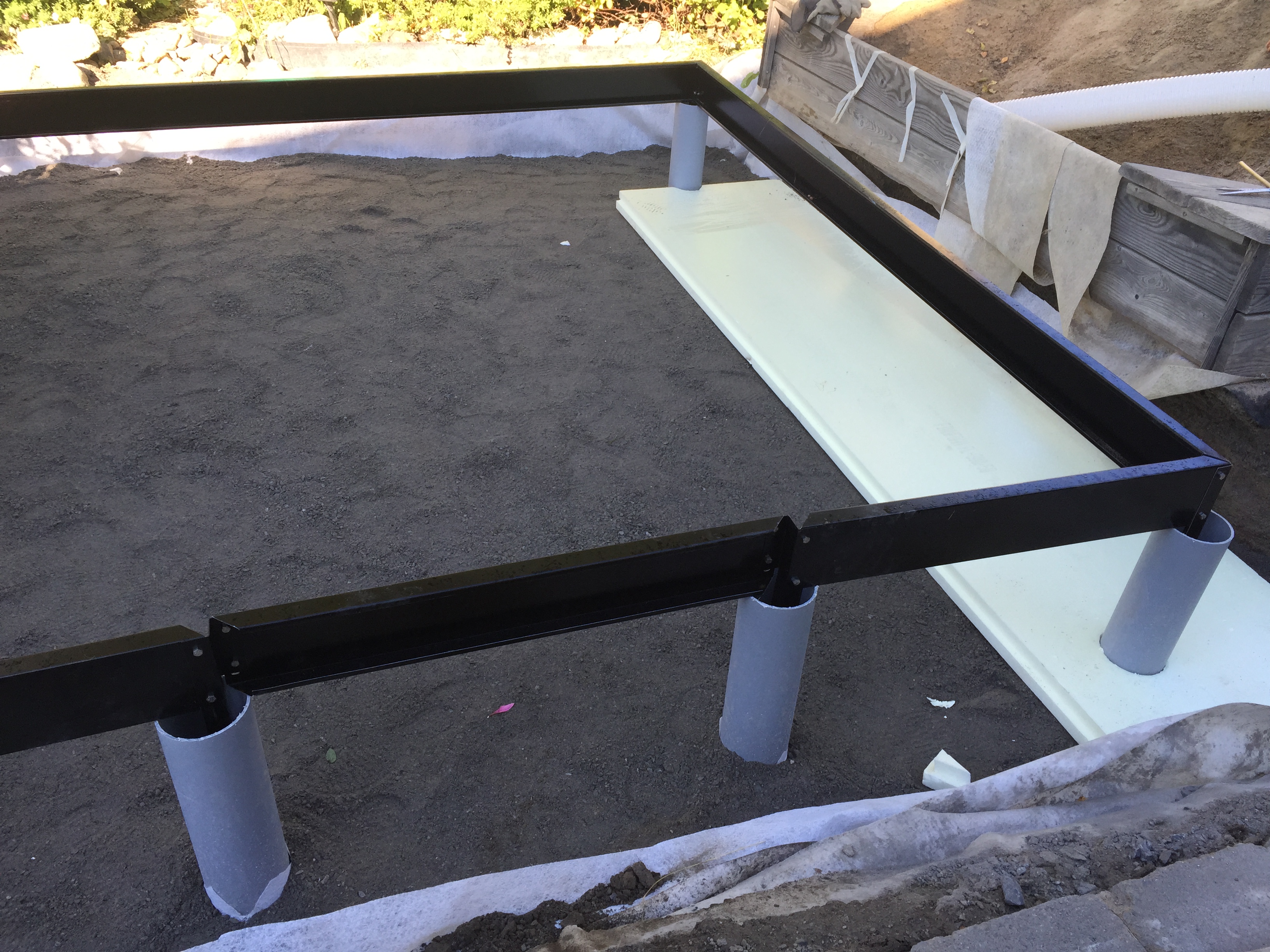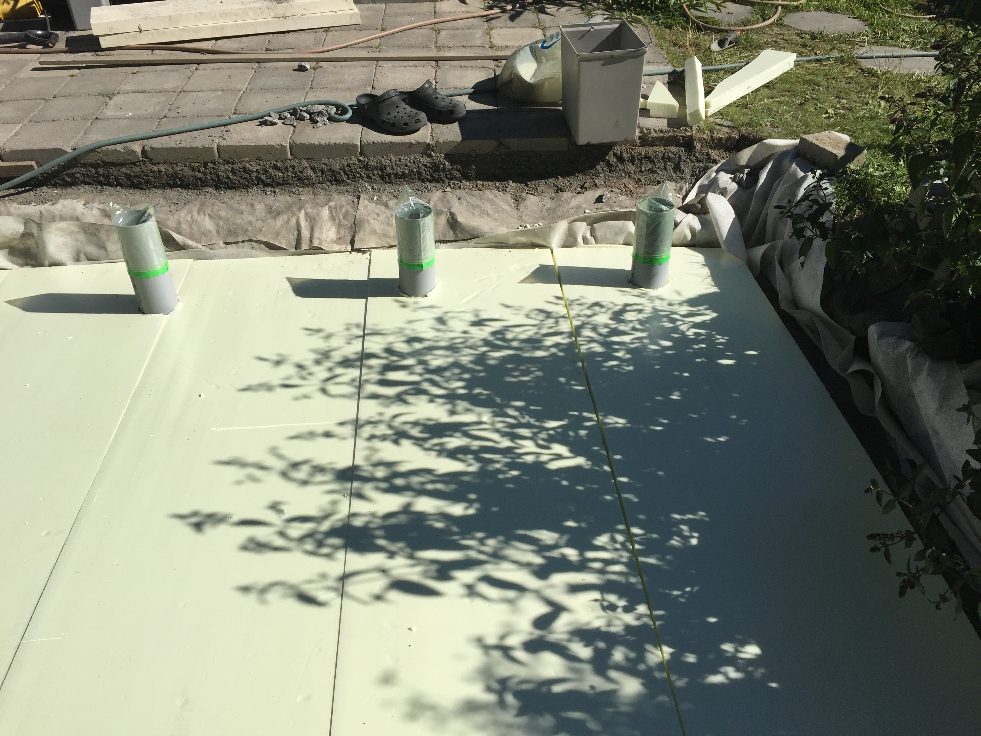 The method of building the foundation for our greenhouse has proved to be a bit more demanding than perhaps some others – hopefully the final outcome will be worth the extra labour. The tricky part is casting concrete into long pipes, that go down into 80 cm depth – i.e. beneath the soil frost line. These concrete pipes, or pillars, need to be cast so that the the steel plinth (base) that will provide the basis for the actual greenhouse will be exactly square shaped in horizontal X & Y directions, while simultaneously also exactly at right even level (Z) so that there will be no tensions into the glasses of the finished greenhouse. The actual freezing protection will be provided by several layers of gravel and sand, separated by filter fabric layers, plus a couple of layers of Finnfoam (extruded polystyrene foam – XPS – thermal insulation). The tricky part is that those pipes I mentioned need to go through all of those other layers, and they need to be made and fixed in pretty much their correct, final positions first, before any other elements of this foundation have yet been built. From the photos underneath you might get an idea how our ambitions have met with the reality so far.