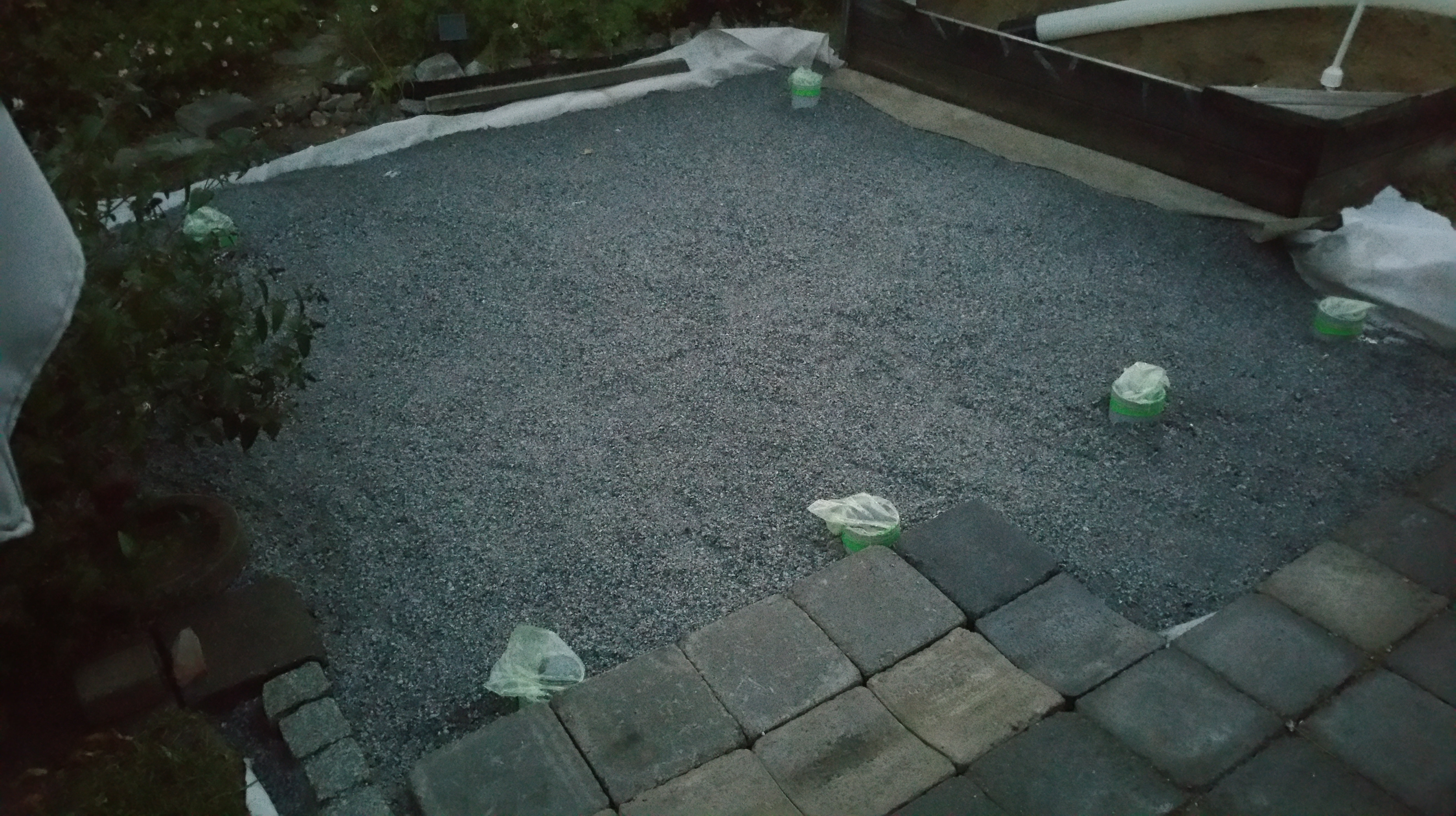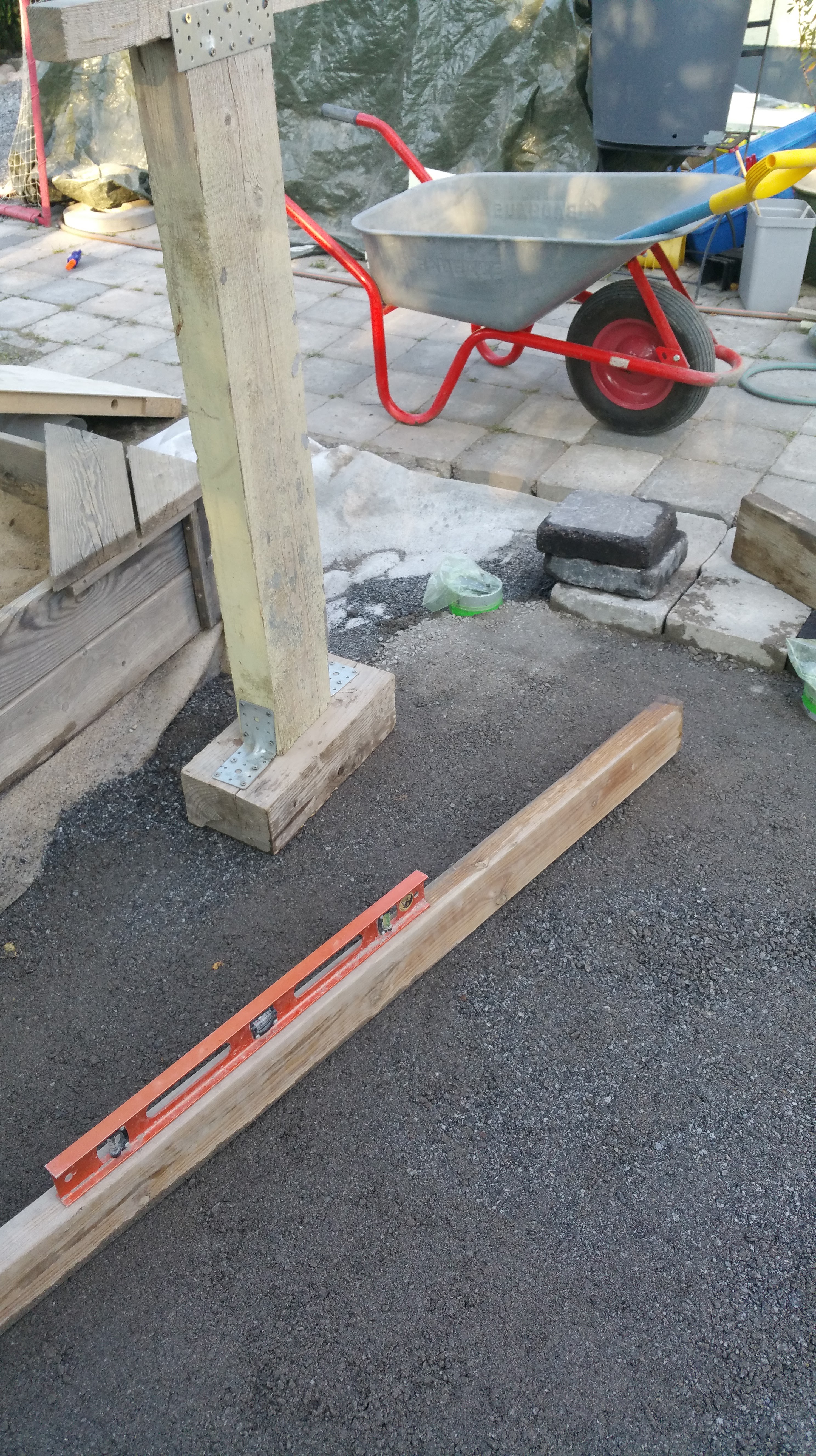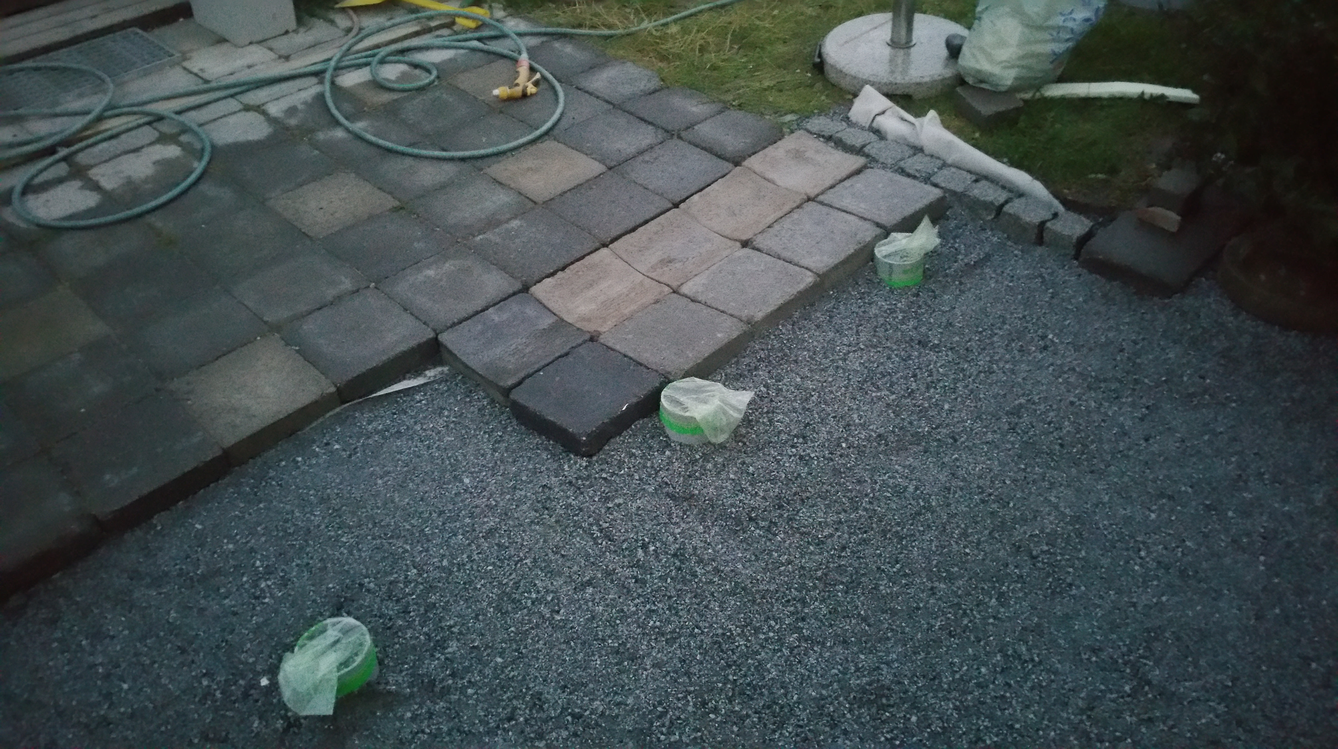 The foundations for the actual greenhouse are now ready, I think. The last steps in this phase included e.g.: using fine gravel and sand (“kivituhka”) to create a top layer that was at right angle and height to serve as the basis for concrete tiles that form the final top layer, supporting the steel plinth. My old heavy wooden ram (“juntta”) was again in use, manually banged down to compress the earth layers. (My academic hand muscles are not perhaps best suited for this kind of work, btw, I noticed the following day…) Before installation of the greenhouse plinth (the steel base), there was one important extra item to take care for, however. The greenhouse was being constructed near – almost underneath – a large old birch, which had already started to rot and drop branches. It was now the very last moment to say goodbye to her (cutting down a large tree later, with delicate glass house underneath, would had been much harder, or impossible). We hired a couple of professinal loggers come and cut the tree into pieces, and there was much work left also to us in sorting out branches (some the size and thickness of regular trees), twigs and leaves. After a full day of that lumberjack work, there was finally time to cast the concrete (oh yes, and a mixture of sand and mortar was brushed into gaps between tiles and dampened to fill them, as a final touch), but before that, the last round of measurements and fine-tuning was done to adjust and fix the steel plinth into the right positions. We had not managed to get all plastic pipes into same exact depth, and a Dremel tool was used to cut few millimeters away from the top of three of the protruding cast pipes. Bubble level was also much in use, and I also applied a couple of spanners to open all the corners of steel plinth, apply small wooden wedges underneath the plinth in a couple of places, and then fix them again, hopefully sealing everything into correct width and length measurements, while also keeping the entire construction at even level, using the bubble level tool. Then it was time to mix some concrete – a small power tool was used, but mostly manual blending (we did not have a proper concrete mixer). It was getting really dark at this point, but finally all the pipes were filled to the brim with concrete (there was beautiful full moon rising, I noticed, and the fireworks from Tampere Venetian Festivals were making popping noices somewhere far away). But: while the doing the control measurements we saw that while the X and Y directions were correct, the steel pinth was not direct – the thin steel bars were tilted (in Z, upwards direction)! It was pretty hard to solve the problem at this point, in dark and middle of the night. But the trick that did it was to loosen again all the nuts and bolts in the corners, move away the concrete tiles that we had used to support and fix the plinth into the right position, as some of them pressed the inner edges of the steel bars inwards so that all of them became tilted. Fixing all that required some fast action, as concrete was already slowly solidifying while all this was going on. While we managed to do all that, there was one measurement that I forgot to take. In the morning, I wanted to kick myself: the front part of Juliana’s steel plinth consists of three separate elements, and I had forgot to check that they were fixed so that the width of plinth in front was the same as the width of plinth at the back (there was room for adjusting the bolts in their elongated holes). We had carefully measured that the diagonals from corner to corner were identical, but forgot to measure that width of back and front were identical. And now all six steel pegs were fixed deep into concrete (with their tips bended, to prevent them from slipping ever out of concrete). Luckily, there was only c. 2 millimeter error between front and back, so the situation was finally not so bad. Hopefully the actual Juliana greenhouse construction has some adjustment room when the aluminium and glass parts will build and fixed on top of the steel plinth.