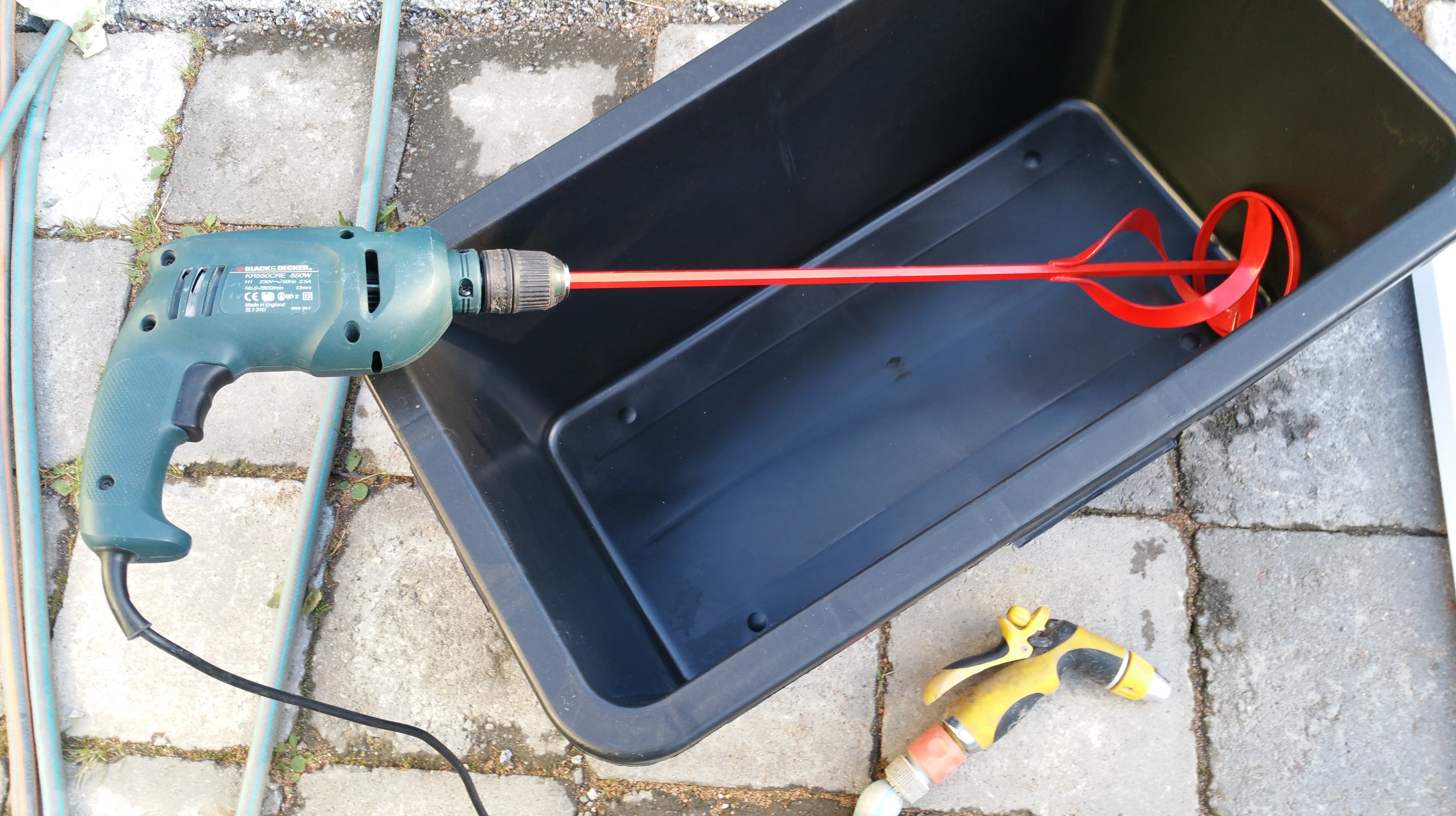 Today the watering system of our greenhouse took some nice steps towards completion – the photos below pretty much tell the story, but: we installed a (Bauhaus) black plastic water barrel for temperature control purposes as well, a (Gardena) water tube system to deliver the water below greenhouse structures, and drilled couple of holes for the automatic Blumat watering system – This is still in “closed loop” mode, until the temperature is high enough for leaving plants permanently into the greenhouse. We tried to find a suitable electric heater from Tampere but it seems no-one has such available.