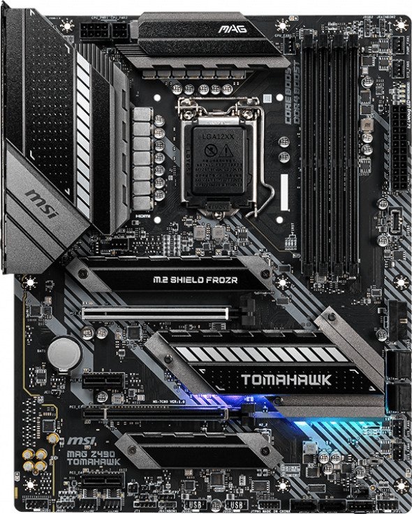 MSI MAG Z490 TOMAHAWK, ATX motherboard (this motherboard appears to strike a nice balance between price vs. solid construction, feature set, and investments put into the Voltage Regulator Modules, VRMs, and other key electronic circuit components)