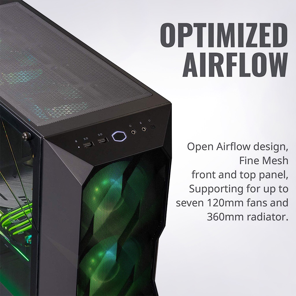 Cooler Master MasterBox TD500 Mesh w/ controller, ATX, Black (this is chosen on the basis of available test results – the priorities for me here were easy installation, efficient air flow, and thirdly silent operation)